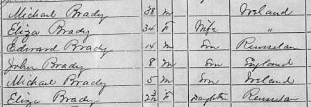 The 1875 NY Census records show that their two oldest children Edward and James were born in Hoosick Falls (Rensselaer County) before the war. Jack was born after the war in England in 1867 and his brother Michael was born in Ireland in 1870. The youngest child Eliza was born in Hoosick Falls in 1873. For whatever reason, the family traveled back to Ireland and then back to the U.S. They may have fled due to the shame of Michael’s desertion and arrest or economic troubles. By 1880, Michael had disappeared and was no longer in the home. He is not mentioned at all in Eliza’s obituary in 1895 which may be an indication of lingering shame or negative feelings toward him.